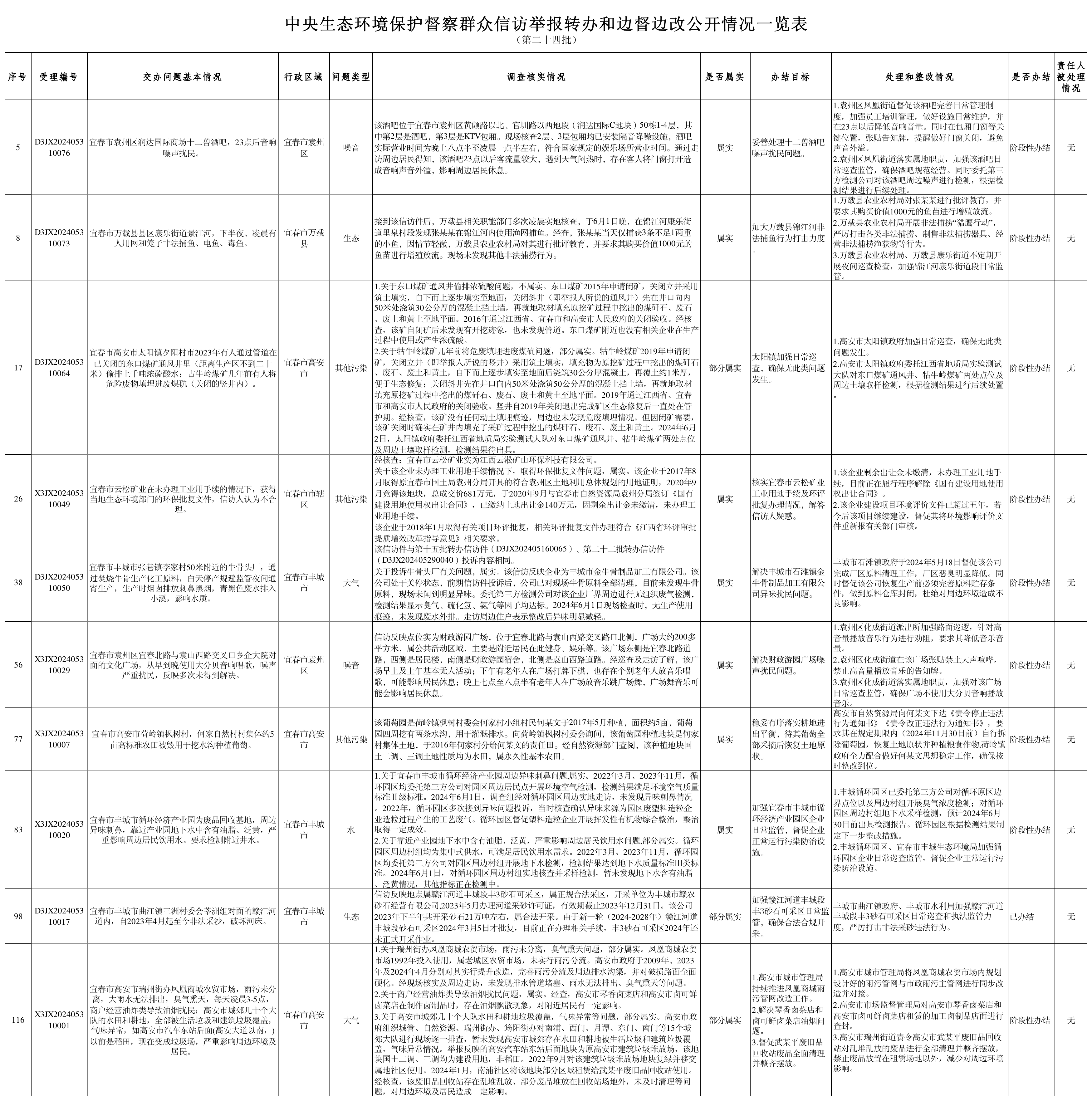 截至6月10日,對(duì)中央第三生態(tài)環(huán)境保護(hù)督察組向宜春市移交的第二十四批群眾信訪舉報(bào)件10件,各責(zé)任單位均按要求上報(bào)調(diào)查處理情況。根據(jù)督察要求,群眾信訪舉報(bào)轉(zhuǎn)辦和邊督邊改公開情況一覽表將在報(bào)紙、網(wǎng)站等媒體上公布。