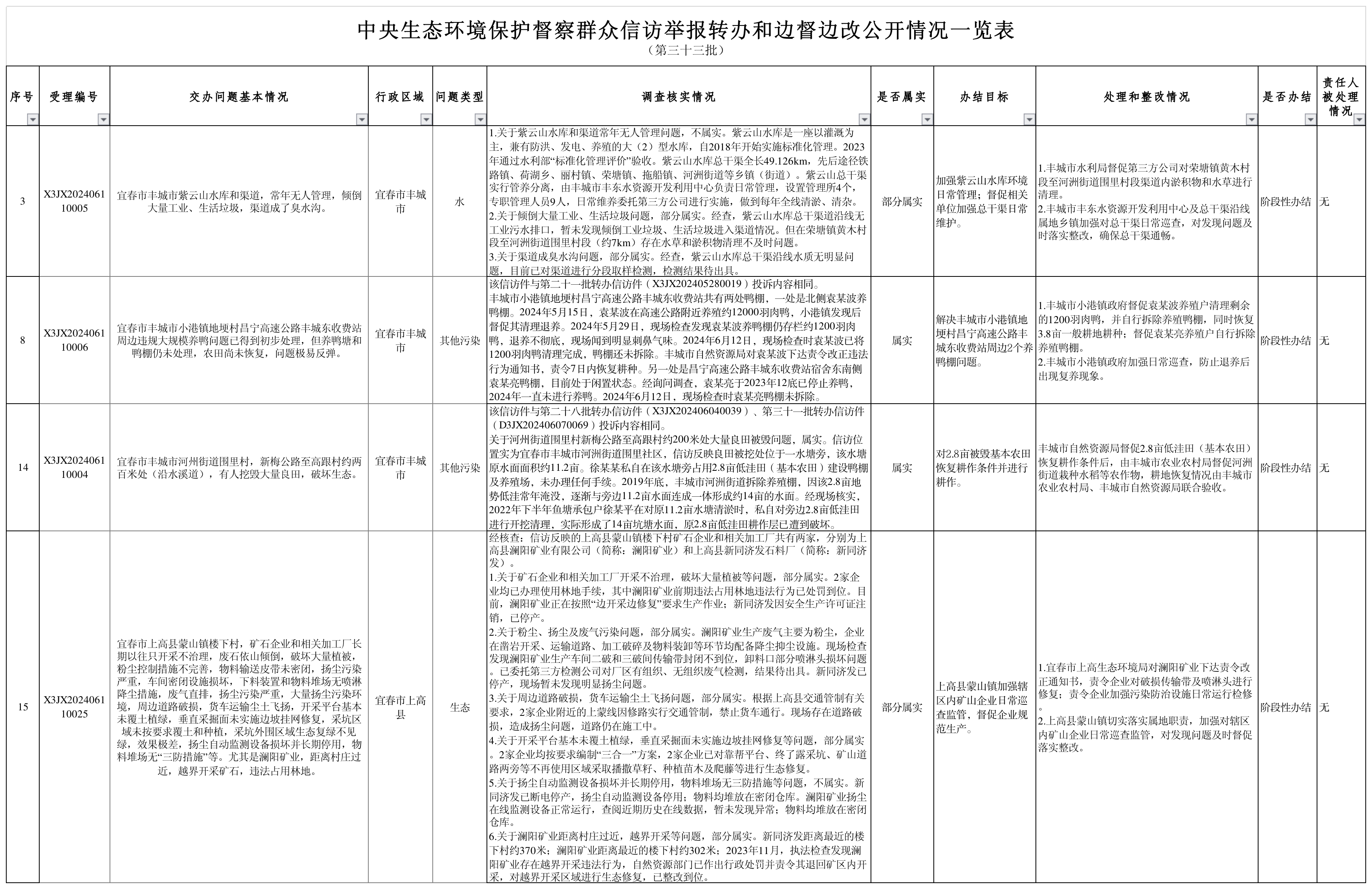 截至6月19日,對中央第三生態環境保護督察組向宜春市移交的第三十三批群眾信訪舉報件4件,各責任單位均按要求上報調查處理情況。根據督察要求,群眾信訪舉報轉辦和邊督邊改公開情況一覽表將在報紙、網站等媒體上公布。
