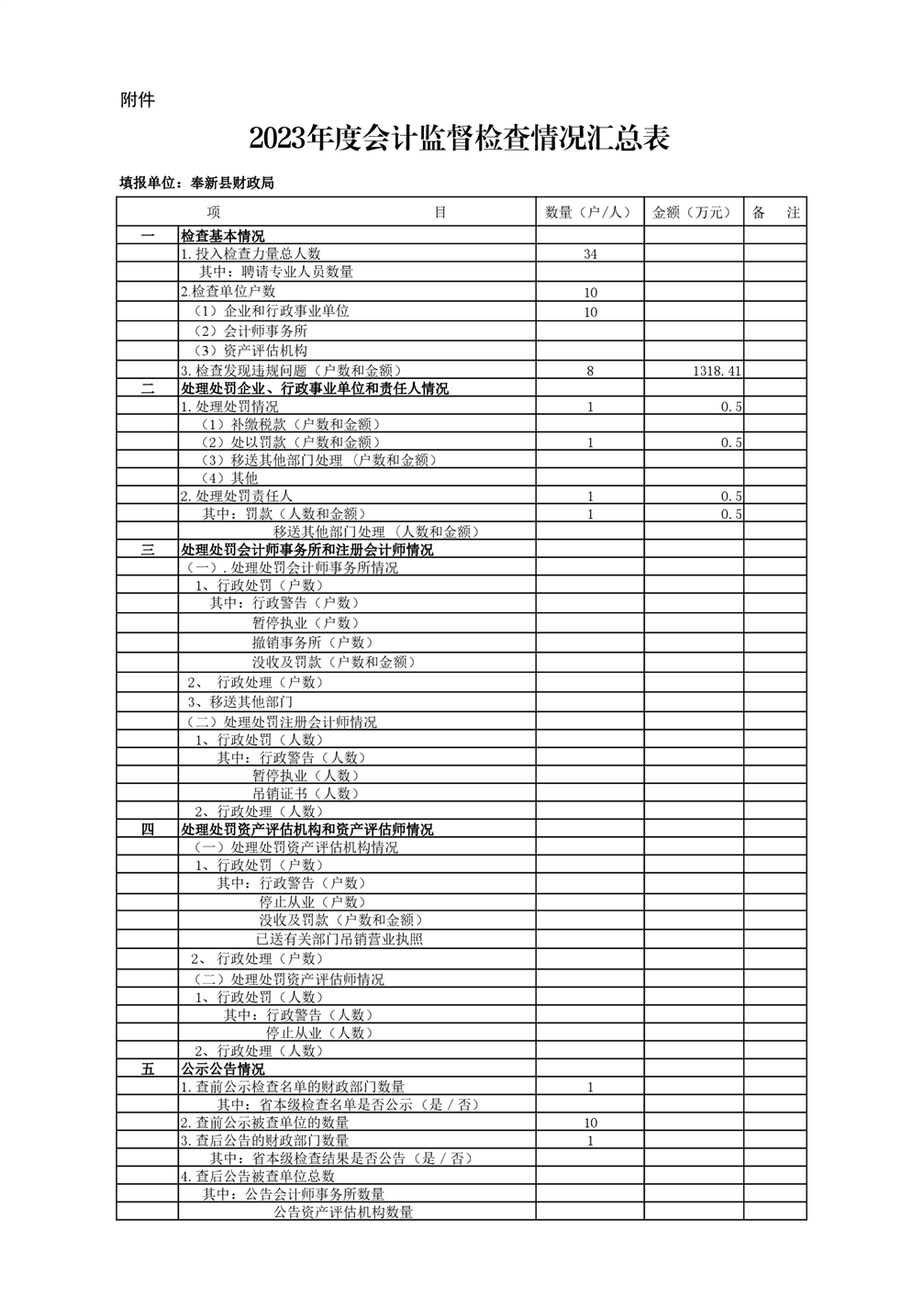 根據《江西省財政廳關于開展2023年度會計信息質量檢查的通知》(贛財監〔2023〕13號)及《宜春市財政局2023年度會計監督檢查實施方案》(宜財監發〔2023〕9號)文件精神,奉新縣財政局認真組織開展了會計監督檢查工作,結合我縣實際,選擇對7家行政事業和3家糧食企業單位開展會計監督檢查。截至目前,發現問題8戶,違規金額1318.41萬元,其中6戶已整改1316.27萬元,未整改1戶2.14萬元。