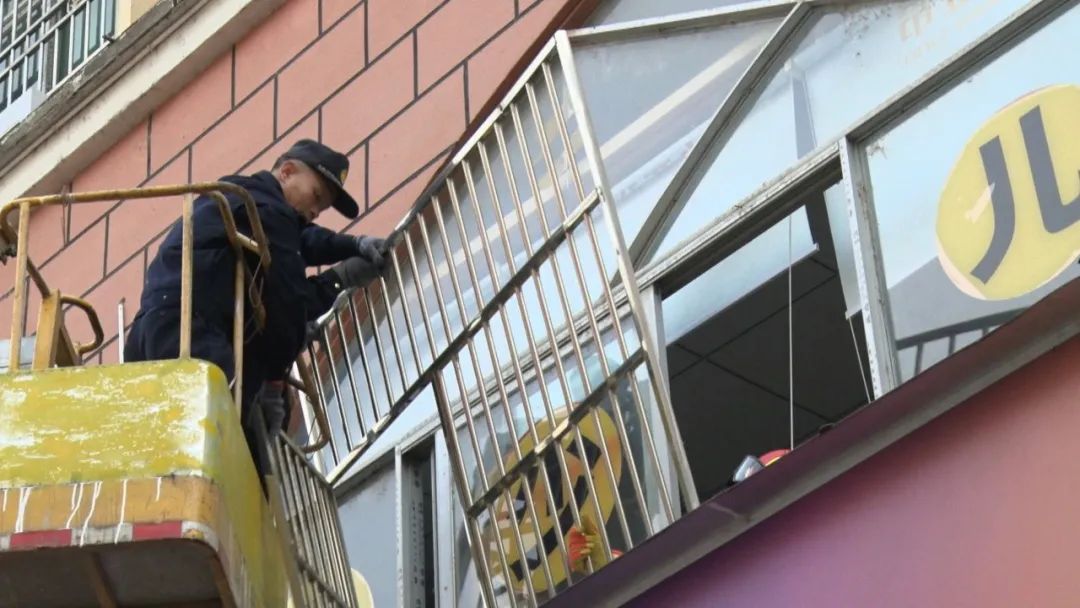 行動現場,來自城管大隊、消防大隊、治安大隊、應急管理局、教體局和社區等多個單位的共60余名工作人員,對商業步行街臨街店鋪在門窗上違規設置影響逃生和滅火救援的防盜網、鐵柵欄、廣告牌、臨時搭建物等多處障礙物進行拆除整改,對部分占用、堵塞、封閉疏散通道、安全出口和消防車通道進行重點排查,并引導臨街店鋪積極配合拆除整改工作。