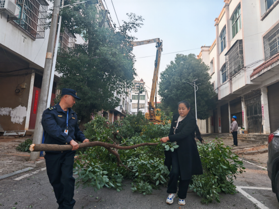 發現隱患后,執法人員迅速響應,立即聯系供電站工作人員前往現場協同處置。鑒于作業涉及高壓電力設施,專業性強、風險較高,縣住建局立即調度路燈所調配升降作業車輛,并組織園林工人現場勘查,制定周密的處置方案。作業期間,各部門人員分工協作、密切配合,在全面落實電力安全防護措施的前提下,使用專業設備對觸及高壓線的危險枝干進行修剪,成功消除了安全隱患,切實保障了周邊群眾的生命財產安全。