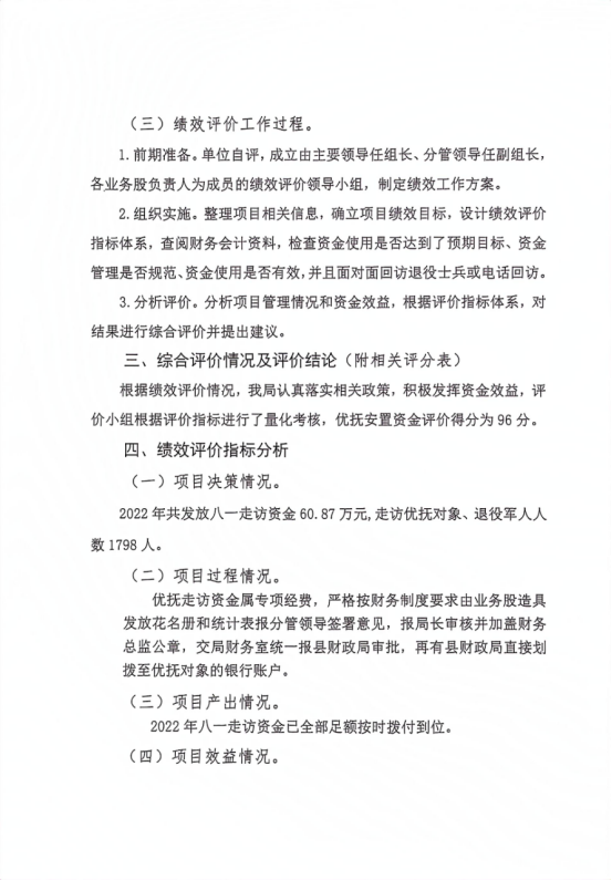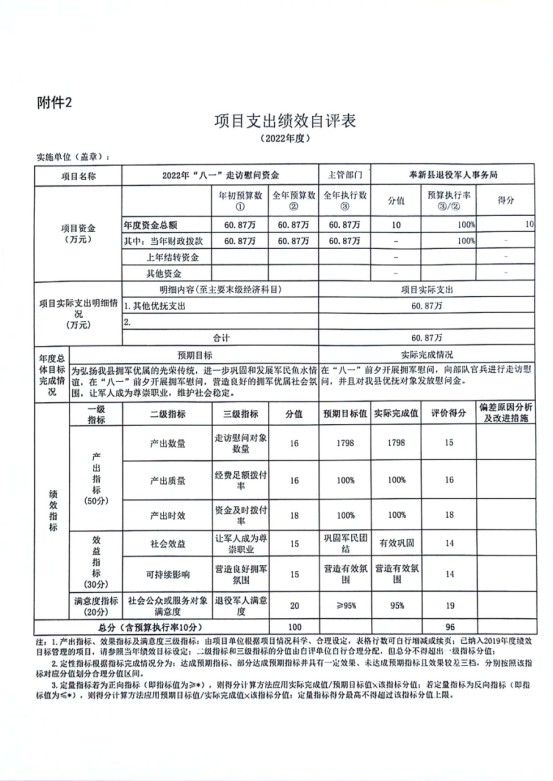 八一走訪慰問經費項目績效自評綜述:根據年初設定的績效目標,工作經費項目績效自評得分為97分。項目全年預算數為60.87萬元,執行數為60.87萬元,完成預算的100%。主要產出和效果:弘揚了我縣擁軍優屬的光榮傳統,進一步鞏固和發展軍民魚水情誼,在“八一”前夕開展擁軍慰問,營造良好的擁軍優屬社會氛圍,讓軍人成為尊崇職業,維護社會穩定。