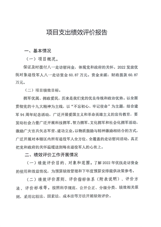 組織對八一走訪慰問經費項目等1個項目開展了部門評價,涉及一般公共預算支出60.87萬元,政府性基金預算支出0萬元,國有資本預算支出0萬元。