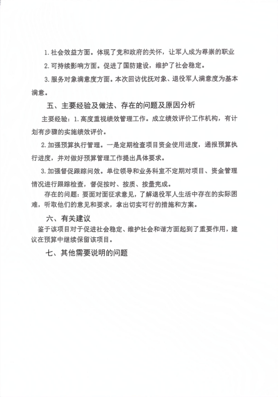 1.社會效益方面。保障了廣大優撫對象、退役士兵合法權益,緩解了優撫對象、退役士兵生活難的問題。