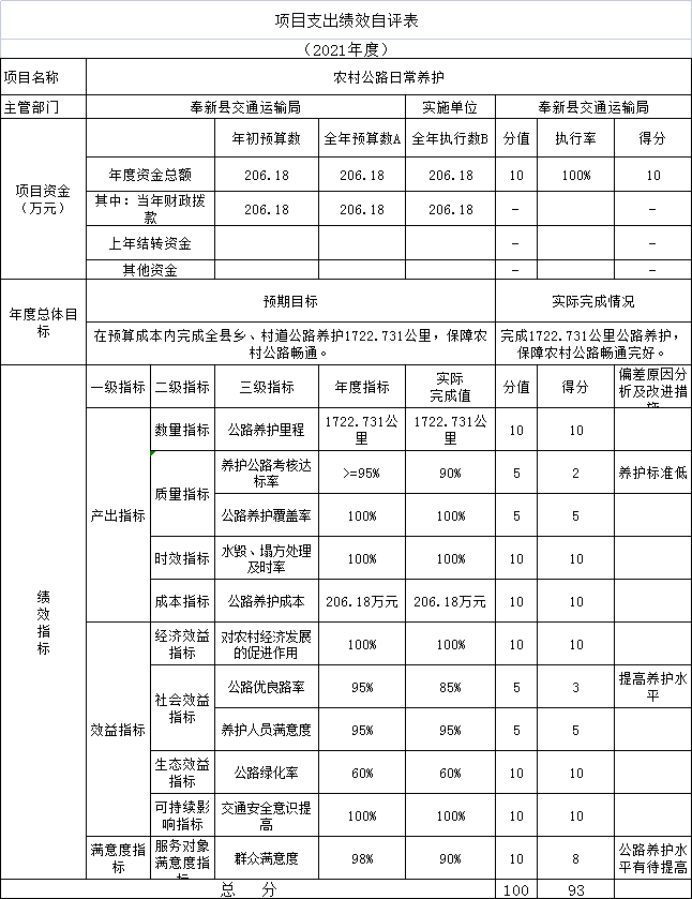 本部門2021年將農村公路日常養護部門評價報告向社會公開。通過對2021年度財政下撥的農村公路養護資金進行績效評價,衡量項目資金的“產出”與“績效”,了解、分析、檢驗項目是否達到預期目標,資金使用是否有效,及時總結經驗,分析存在的問題,采取切實有效的措施進一步改進和加強財政支出項目管理,切實提高財政資金使用效益,最終評價結果為91分,評價等次為優。詳見附件:農村公路日常養護項目支出績效評價報告