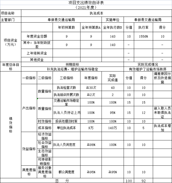 組織開展部門整體支出績效評價,涉及一般公共預算支出 848.5萬元,政府性基金預算支出0萬元。從評價情況來看,為做好預算績效管理,奉新縣交通運輸局成立了預算管理和評價小組,安排專人負責資料收集、目標管理、績效監管和績效評價管理工作,建立相應指標體系,對資金使用情況進行績效檢查,較好地完成了年初預算目標和工作任務。