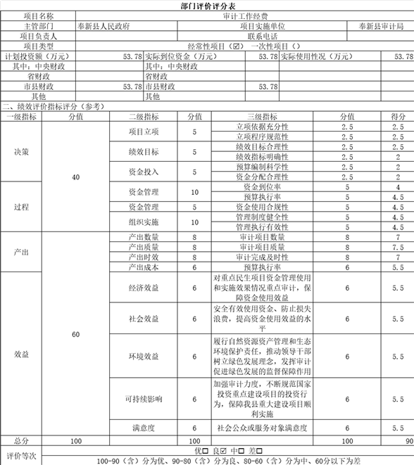 奉新縣審計(jì)局在促進(jìn)令行禁止、維護(hù)經(jīng)濟(jì)安全、推動(dòng)深化改革、推進(jìn)廉政建設(shè)等方面作出了積極貢獻(xiàn),較圓滿地完成了各預(yù)算項(xiàng)目年度績效目標(biāo)。