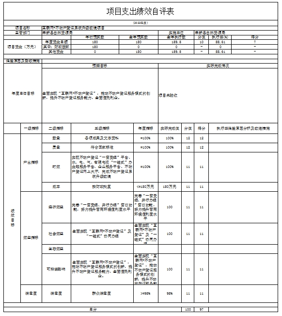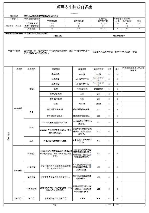 組織對“互聯網+不動產登記系統升級改造”、“奉新縣巷口含鋰瓷石礦詳查”等2個項目開展了部門評價,涉及一般公共預算支出0萬元,政府性基金預算支出555萬元,國有資本預算支出0萬元。從評價情況來看,2022年度這兩個項目的項目績效目標已全部完成,項目支出績效評價得分為優,并且各項工作都有序推進,較好地完成了全年任務目標,預算資金支出合理,財務管理制度健全,支出績效目標執行到位。