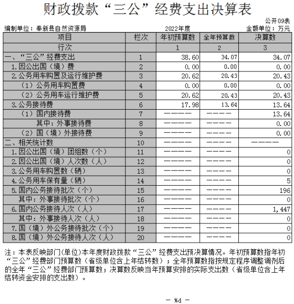 “三公”經費支出:指用一般公共預算財政撥款安排的因公出國(境)費、公務用車購置及運行維護費和公務接待費。其中,因公出國(境)費反映單位公務出國(境)的國際旅費、國外城市間交通費、住宿費、伙食費、培訓費、公雜費等支出;公務用車購置及運行維護費反映單位公務用車車輛購置支出(含車輛購置稅、牌照費),按規定保留的公務用車燃料費、維修費、過橋過路費、保險費、安全獎勵費用等支出;公務接待費反映單位按規定開支的各類公務接待(含外賓接待)支出。