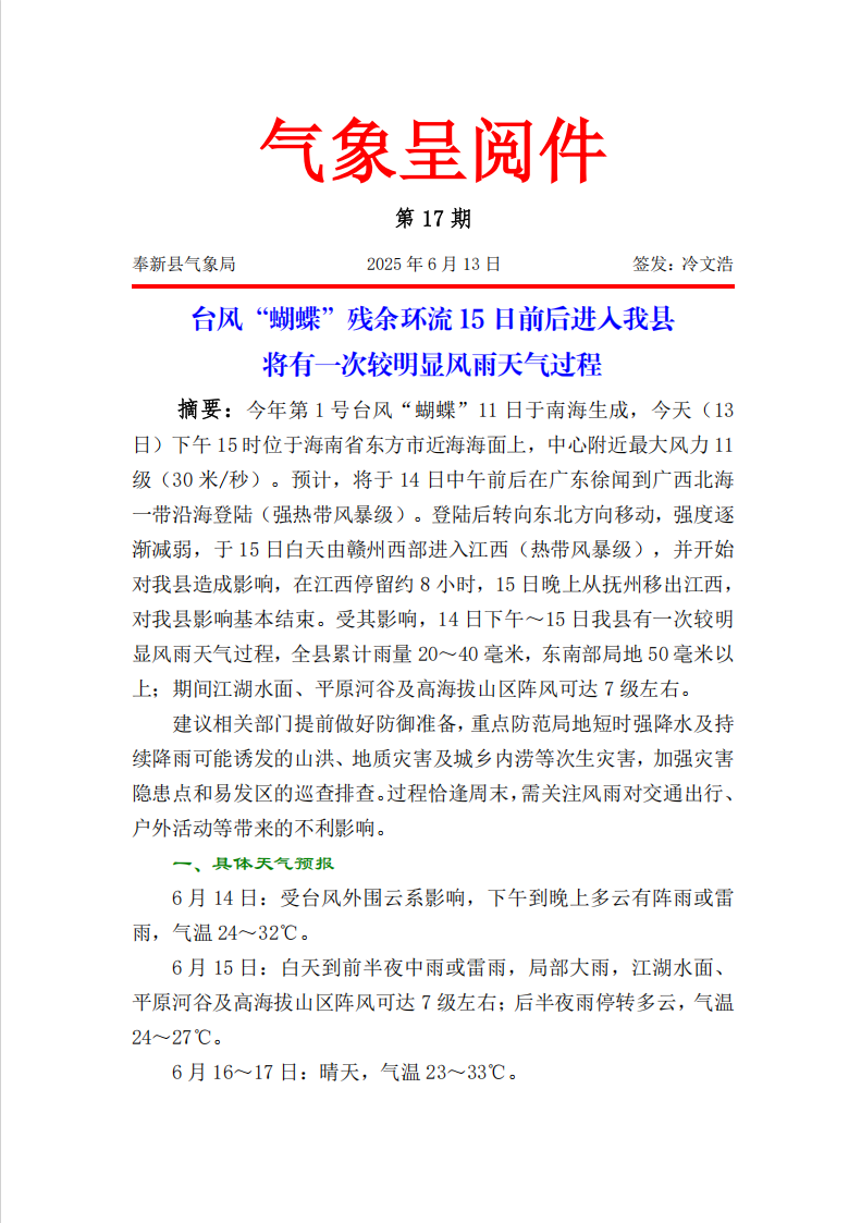 2025年氣象呈閱件第17期(臺風“蝴蝶”殘余環(huán)流15日前后進入我縣+將有一次較明顯風雨天氣過程)