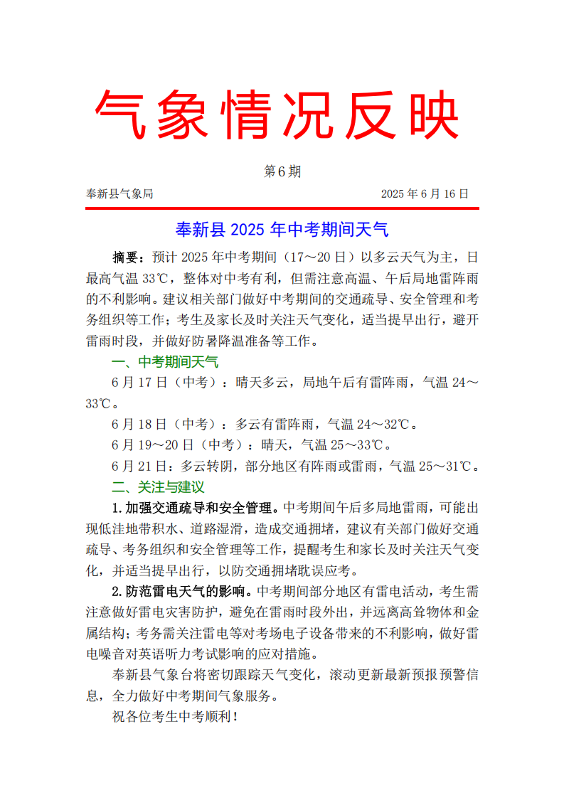 2025年氣象情況反映第6期(奉新縣2025年中考期間天氣)