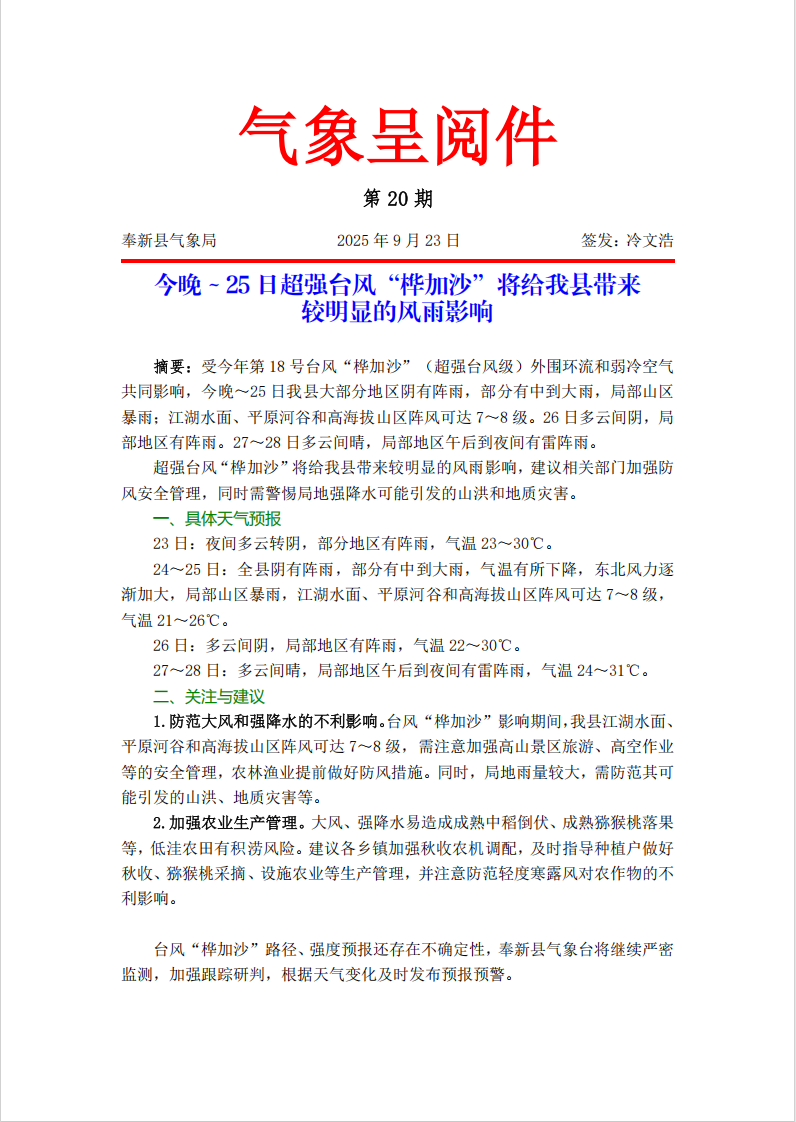2025年氣象呈閱件第20期(今晚~25日超強臺風“樺加沙”將給我縣帶來較明顯的風雨影響)