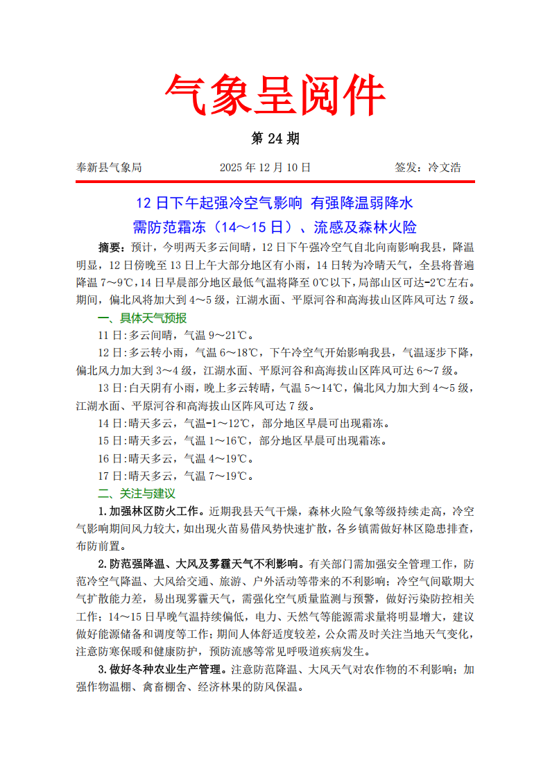 2025年氣象呈閱件第24期(12日下午起強(qiáng)冷空氣影響 有強(qiáng)降溫弱降水需防范霜凍(14~15日)、流感及森林火險(xiǎn))