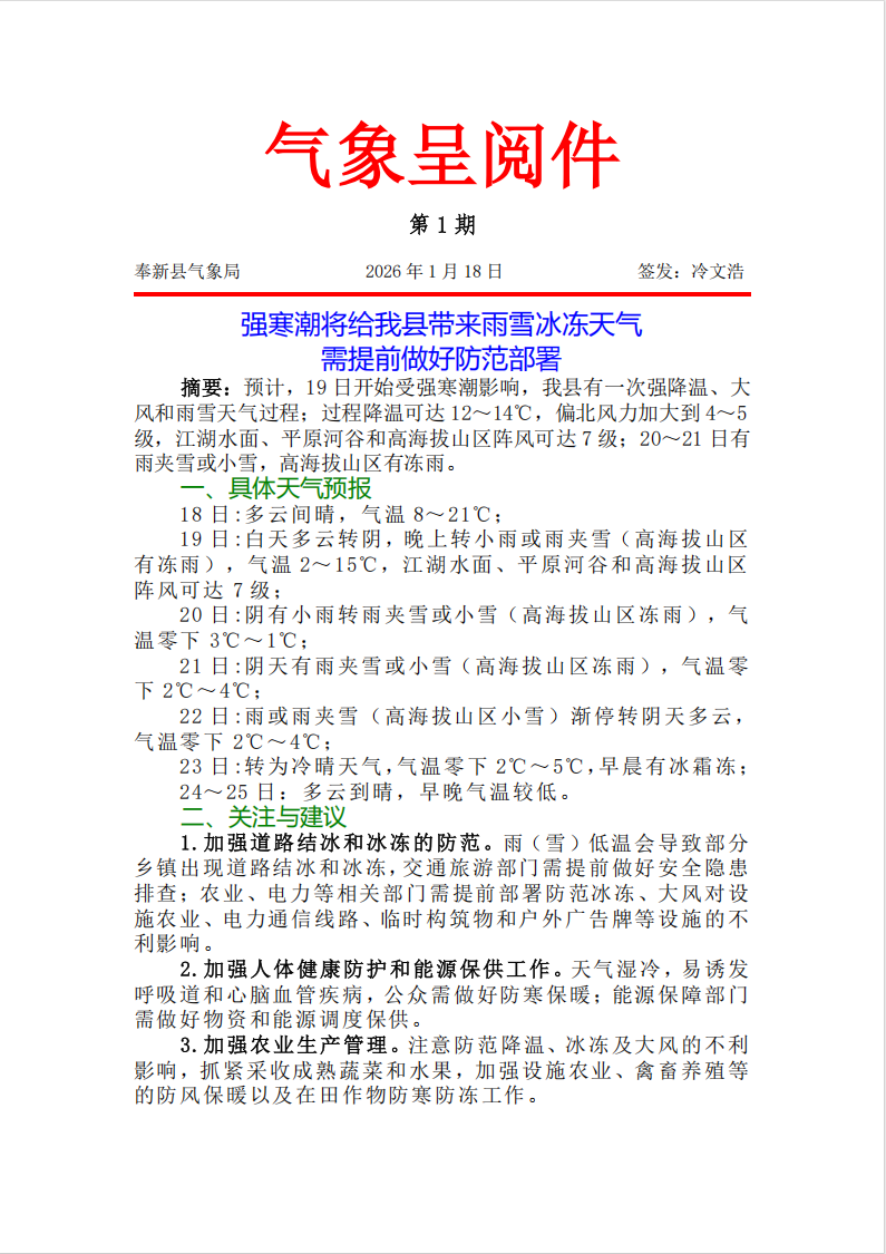 2026年氣象呈閱件第1期(強寒潮將給我縣帶來雨雪冰凍天氣 需提前做好防范部署)