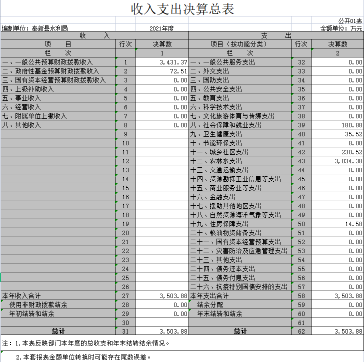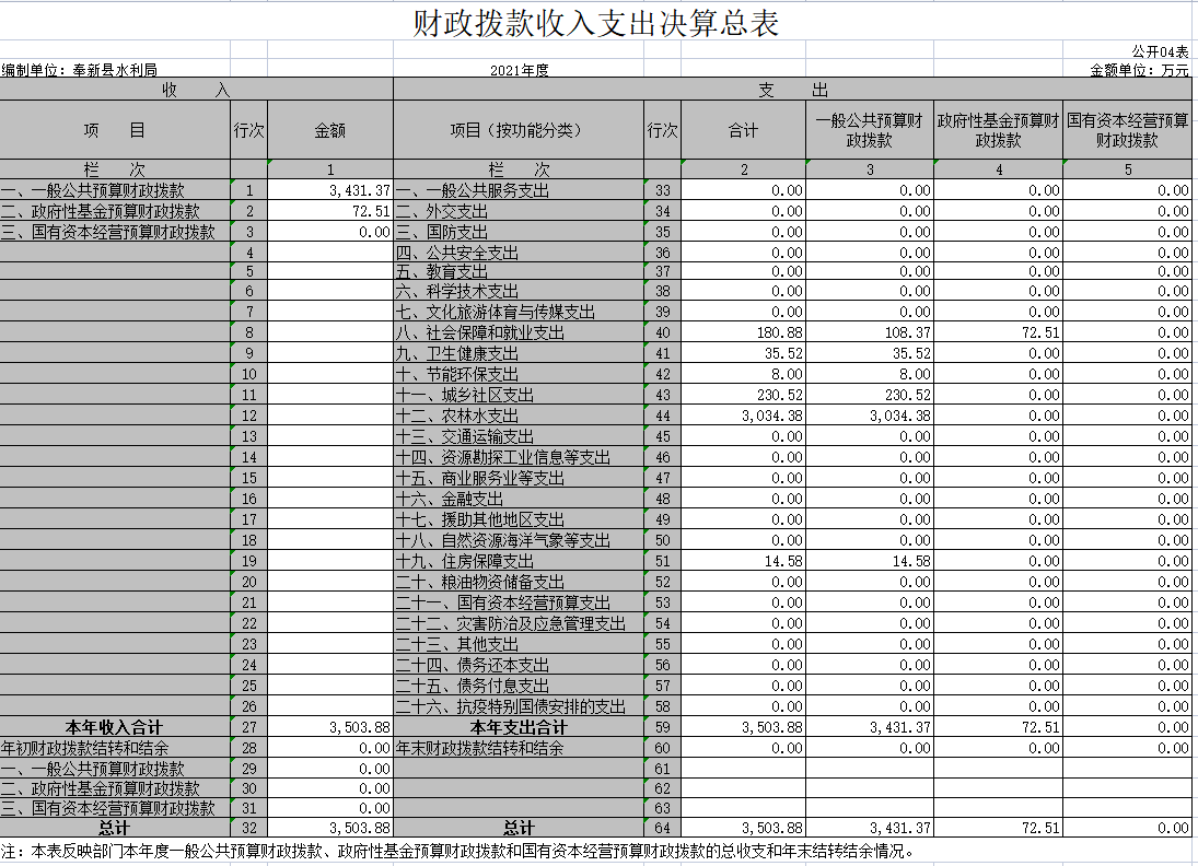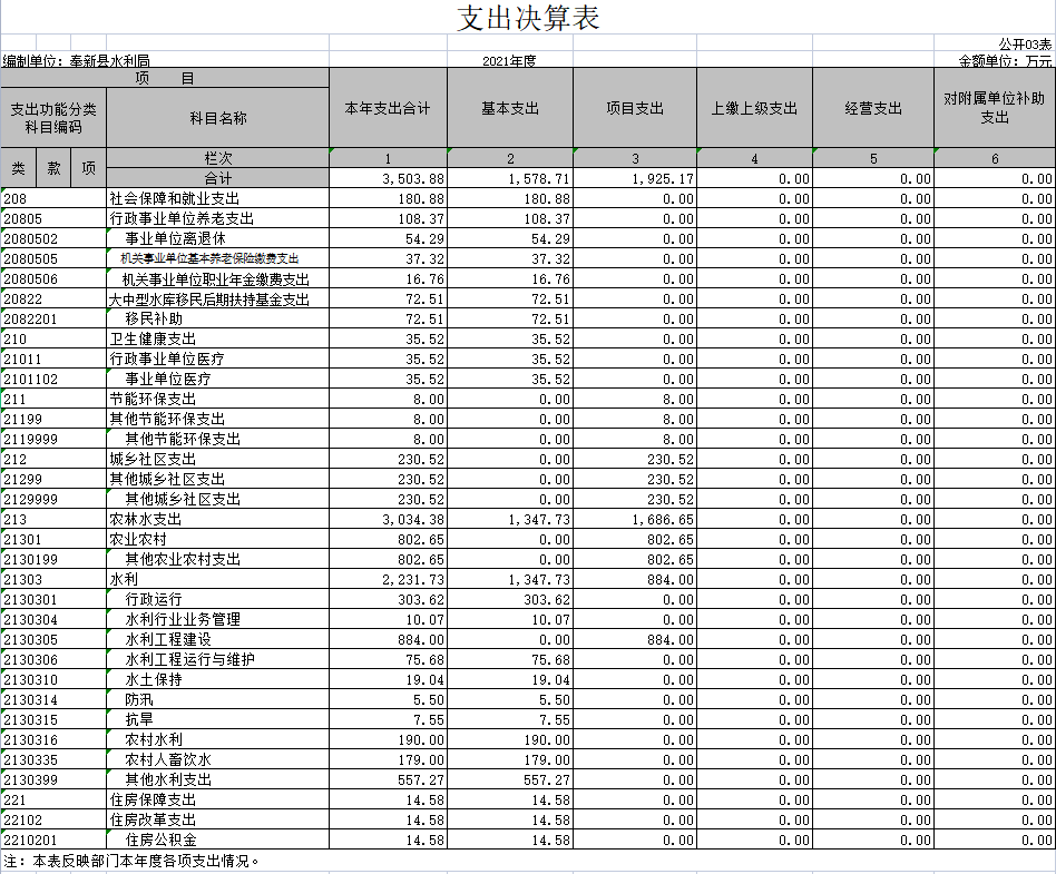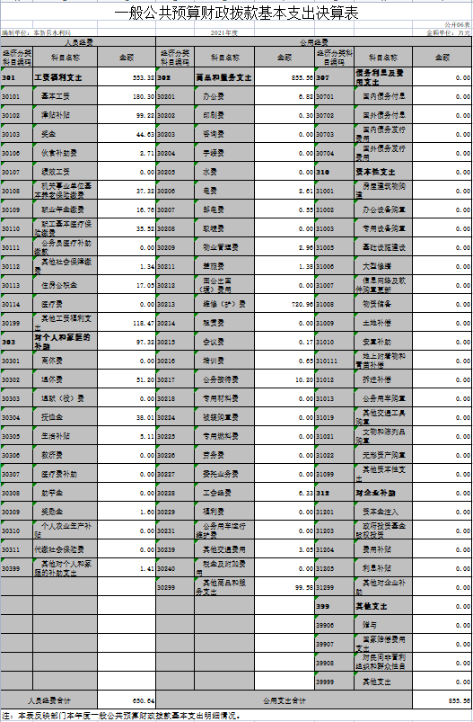 本部門2021年度支出總計3503.88萬元,其中本年支出合計3503.88萬元,較2020年減少8832.99萬元,下降71.60%,主要原因是:上級及本級水利工程項目減少;年末結轉和結余 0萬元,較2020年減少0萬元,下降0%,主要原因是:年初無年末結轉和結余。