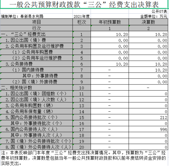 (二十一)“三公”經費支出:指用一般公共預算財政撥款安排的因公出國(境)費、公務用車購置及運行維護費和公務接待費。其中,因公出國(境)費反映單位公務出國(境)的國際旅費、國外城市間交通費、住宿費、伙食費、培訓費、公雜費等支出;公務用車購置及運行維護費反映單位公務用車車輛購置支出(含車輛購置稅、牌照費),按規定保留的公務用車燃料費、維修費、過橋過路費、保險費、安全獎勵費用等支出;公務接待費反映單位按規定開支的各類公務接待(含外賓接待)支出。