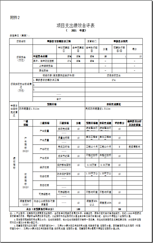 將2021年度縣級部門績效自評總報告(績效自評總報告主要包括本部門項目績效目標情況、單位自評工作開展情況、綜合評價結論、績效目標完成情況總體分析、偏離績效目標的原因和改進措施、績效自評結果應用情況。)和《項目支出績效自評表》(自選2個項目)進行公開。