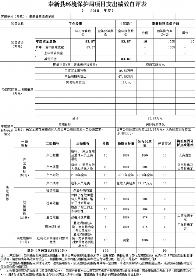 組織對奉新縣環境保護局1個項目開展部門績效評價,涉及一般公共預算支出83.87萬元。從評價情況來看,奉新縣環境保護局預算執行整體情況較好,各項績效指標實際完成值與預期目標值相差小,評價得分較高,項目得到很好的執行。