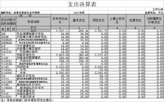 (三)節(jié)能環(huán)保支出年初預(yù)算數(shù)為374萬(wàn)元,決算數(shù)為2603.08萬(wàn)元,完成年初預(yù)算的696%,主要原因是:項(xiàng)目支出增加。