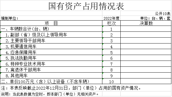 截至2022年12月31日,本部門國有資產占用情況見公開10表《國有資產占用情況表》。其中車輛中的其他用車2輛。