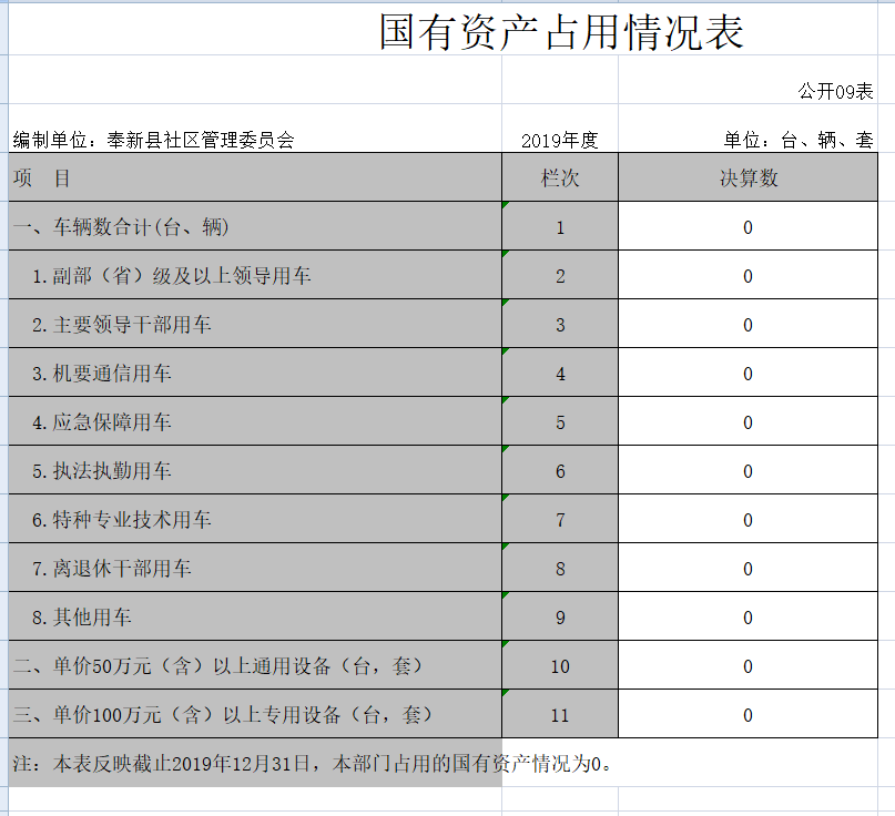截止2019年12月31日,本部門共有車輛0 輛,其中,副 部(省)級及以上領導用車0輛、主要領導干部用車 0輛、機要 通信用車 0輛、應急保障用車0 輛、執法執勤用車0 輛、特種專 業技術用車0輛、其他用車0 輛,其他用車主要是無;單位價 值50萬元以上通用設備 0臺(套);單位價值100萬元以上專 用設備臺(0套)。