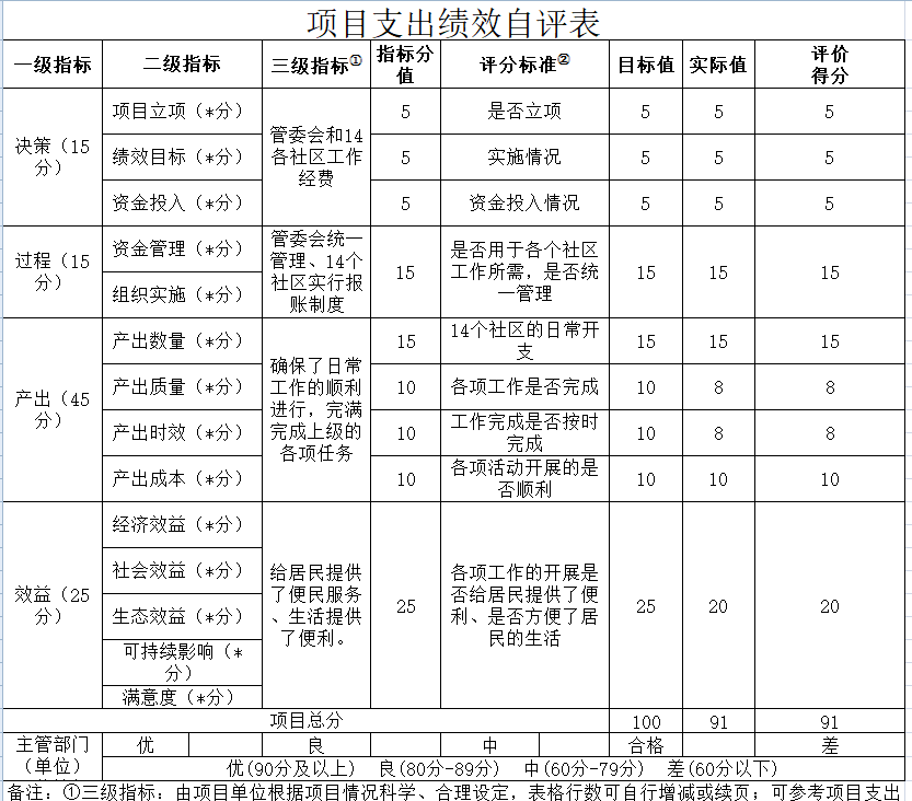 組織對社區工作經費1個項目開展了部門評價,涉及一般公共預算支出132.93萬元。以績效目標實現為導向,進一步加強制度建設,提升自評質量,預算績效管理取得新成效。一是抓好績效目標編制,及時報送績效目標。二是探索績效跟蹤監控,要求加強過程監控。三是深入開展財政支出績效評價,對專項資金實施績效自評,在此基礎上形成自評報告。四是加強評價結果應用,組織績效自評和績效跟蹤監控,對發現的問題及時改進。五是健全績效管理工作機制,明確職責分工,努力提高了績效管理工作水平。