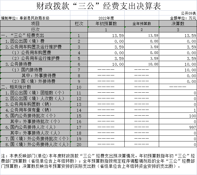 “三公”經費支出:指用財政撥款安排的因公出國(境)費、公務用車購置及運行維護費和公務接待費。其中,因公出國(境)費反映單位公務出國(境)的國際旅費、國外城市間交通費、住宿費、伙食費、培訓費、公雜費等支出;公務用車購置及運行維護費反映單位公務用車車輛購置支出(含車輛購置稅、牌照費),按規定保留的公務用車燃料費、維修費、過橋過路費、保險費、安全獎勵費用等支出;公務接待費反映單位按規定開支的各類公務接待(含外賓接待)支出。