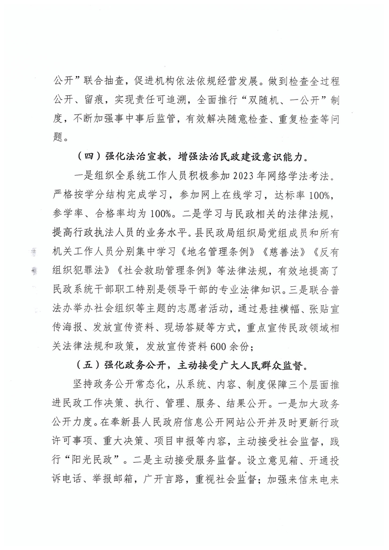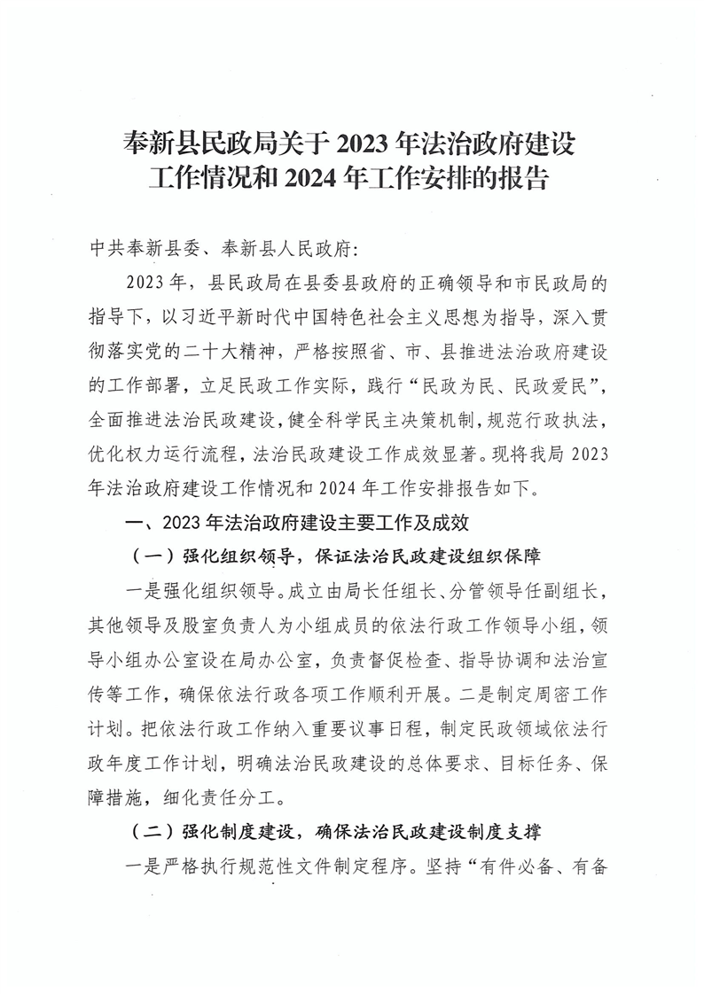 奉新縣民政局關于2023年法治政府建設工作情況和2024年工作安排的報告