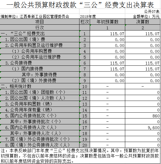 本部門2019年度一般公共預算財政撥款“三公”經費支出年初預算數為 115.07 萬元,決算數為 115.07 萬元,完成年初預算的 100 %,決算數較2018年增加 0 萬元,增長 0 %,其中: