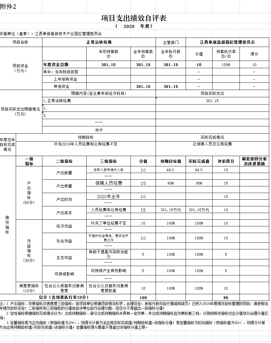 正常運轉經費項目績效自評綜述:根據年初設定的績效目標,正常運轉經費項目績效自評得分為 95 分。項目全年預算數為 301.15 萬元,執行數為301.15萬元,完成預算的 100 %。主要產出和效果:一是項目立項、績效目標設置、資金投入等方面都達到目標值,執行到位;二是資金管理、組織實施部分都得到落實,達到目標值,表現較好。發現的問題及原因:績效評價自評工作還需在現有的基礎上加強組織領導、加強監督。下一步改進措施:一是加強組織領導。要加強對工作的全面領導,便于及時發現工作運行過程中出現的問題并加以改進;二是加強監督。對日常工作加強規范和監督,防止在執行過程中出現偏差。