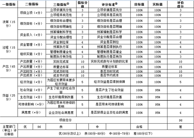 我部門綜合評價等級為優,項目績效總體執行較好。一是決策層面:項目立項、績效目標設置、資金投入等方面都達到目標值,執行到位。二是過程執行層面:資金管理、組織實施部分都得到落實,達到目標值,表現較好。三是產出層面:產出質量、產出質量、產出時效以及產出成本的完成度都很高,達到目標值。四是效益層面:經濟效益、生態效益、可持續影響和公眾滿意度都得到較好保障,目標值與實際值差距小,總體實施情況較好。