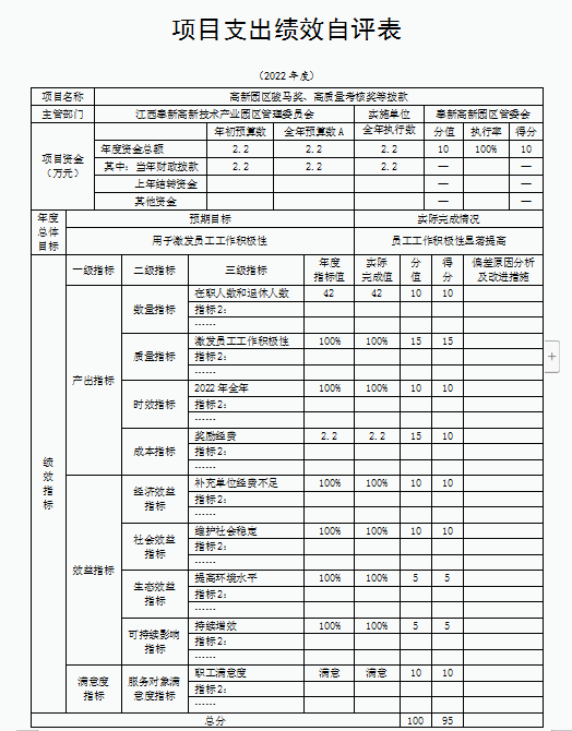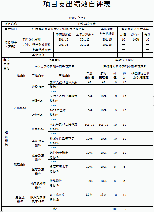 本部門項目績效目標為保障人員經費和公用經費,激發干職工干事創業的積極性,促進園區經濟發展。奉新縣高新園區管委會財政部門的規定,成立了績效考評小組。嚴格執行國家、省有關政策,制定了資金使用辦法,并指定專人管理,專人負責。并認真收集、整理了資金來源和使用情況等資料后,完成自評工作。我部門綜合評價等級為優,項目績效總體執行較好。一是決策層面:項目立項、績效目標設置、資金投入等方面都達到目標值,執行到位。二是過程執行層面:資金管理、組織實施部分都得到落實,達到目標值,表現較好。三是產出層面:產出質量、產出質量、產出時效以及產出成本的完成度都很高,達到目標值。四是效益層面:經濟效益、生態效益、可持續影響和公眾滿意度都得到較好保障,目標值與實際值差距小,總體實施情況較好。2022年度人員經費和日常公用經費都得到保障,干職工干事創業積極性高,本部門績效目標基本實現,未偏離績效目標。本部門績效結果將根據要求進行公開。