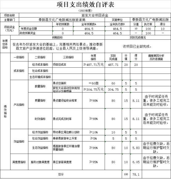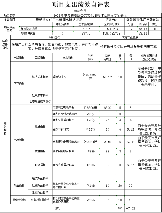 本部門“2023年中央和省級公共文化服務體系建設專項資金”、“旅發大會項目資金” 項目支出績效自評結果如下: