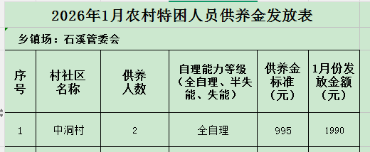 2026年1月農村特困人員供養(yǎng)金發(fā)放表