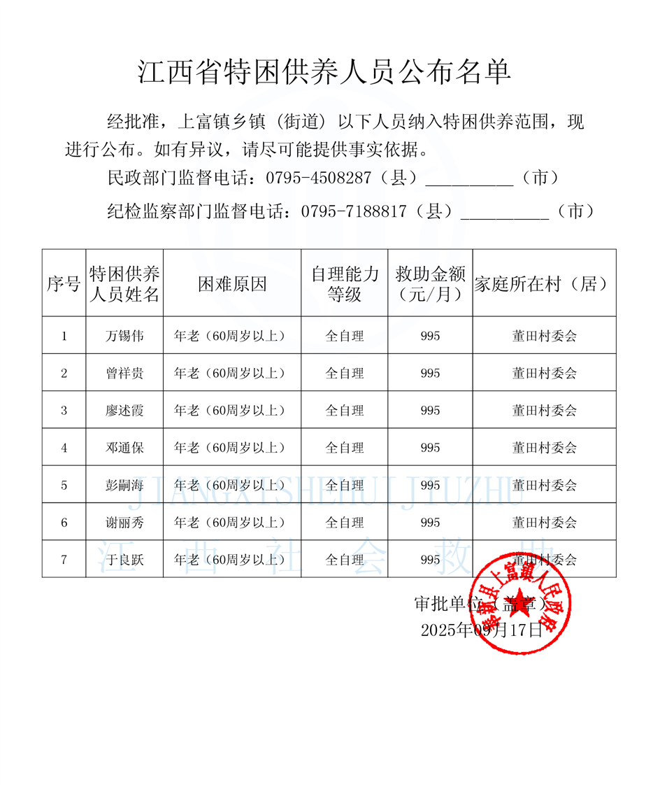 【社會救助】2025年9月份上富鎮特困供養人員供養金發放表