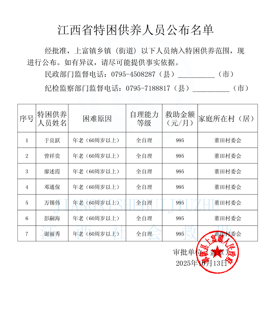 【社會救助】2025年10月份上富鎮特困供養人員供養金發放表