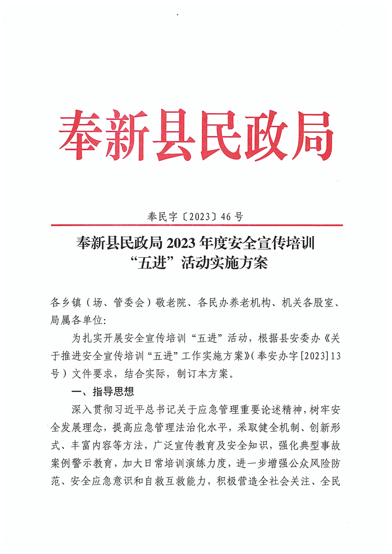 奉新縣民政局2023年度安全宣傳培訓“五進”活動實施方案