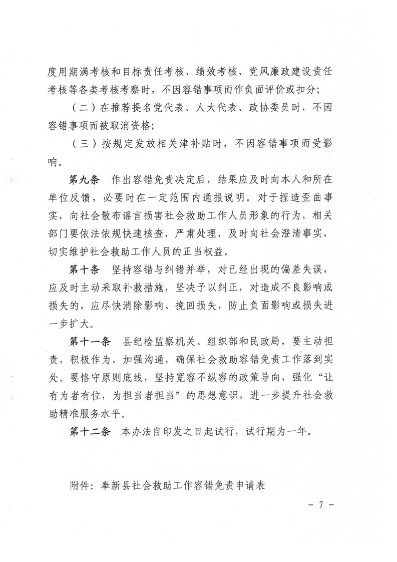 關于印發《奉新縣社會救助工作容錯免責辦法(試行)》的通知