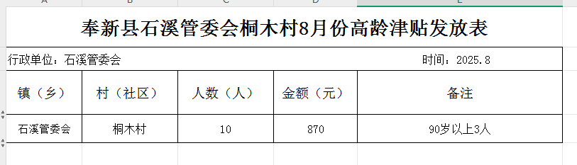 【高齡津貼】奉新縣石溪管委會桐木村2025年8月份高齡津貼發放表