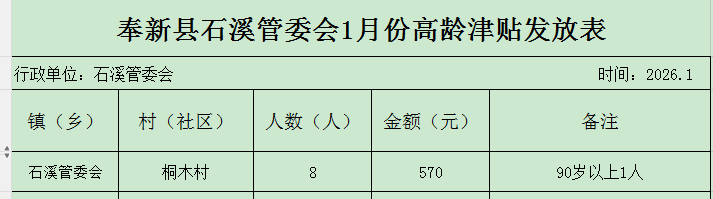 【高齡津貼】石溪管委會2026年1月份高齡津貼發放表