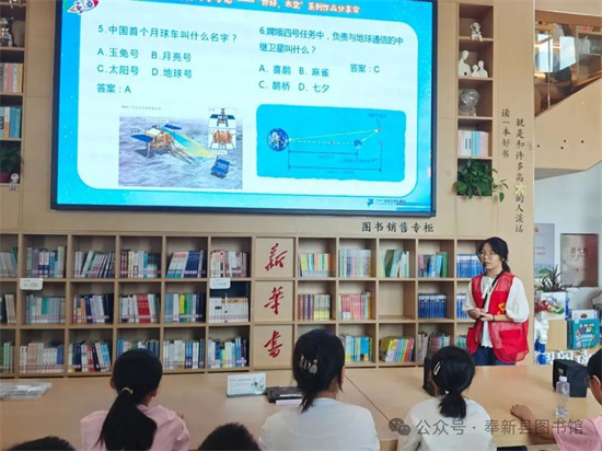 活動在航天知識講解中拉開帷幕。從“天宮空間站為什么叫‘天宮’?”到“中國首位航天員是誰?”,一個個趣味問題瞬間點燃了小讀者們的好奇心。來自江西科技師范大學(xué)的志愿者李心雨化身“航天科普師”,以童趣化的語言,將中國空間站的精密結(jié)構(gòu)、航天員在太空中的“懸浮生活”以及“嫦娥工程”背后的探月傳奇娓娓道來。小讀者們聚精會神地聆聽,小手高舉搶答,科學(xué)的種子在稚嫩的心田悄然萌芽。