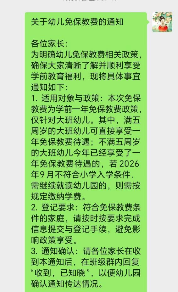 從2025年秋季學期起,免除公辦幼兒園學前一年在園兒童保育教育費。對在教育部門批準設立的民辦幼兒園就讀的適齡兒童,參照當地同類型公辦幼兒園免除水平,相應減免保育教育費。