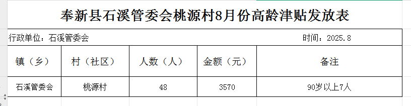 【高齡津貼】奉新縣石溪管委會桃源村2025年8月份高齡津貼發放表