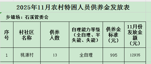 桃源村2025年11月農(nóng)村特困人員供養(yǎng)金發(fā)放表