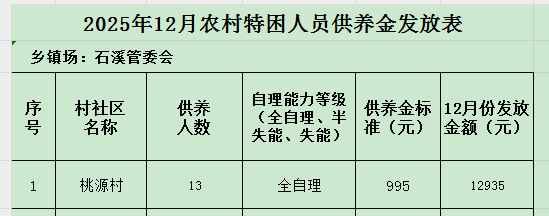 桃源村2025年12月農村特困人員供養金發放表