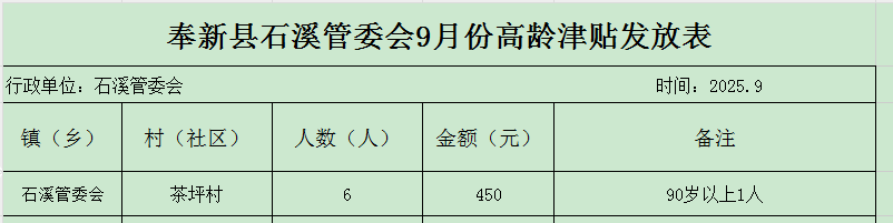 【高齡津貼】奉新縣石溪管委會茶坪村2025年9月份高齡津貼發(fā)放表