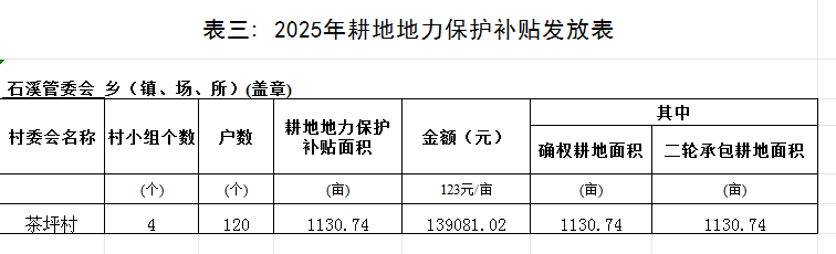 【耕地補(bǔ)貼】石溪管委會(huì)茶坪村2025年耕地地力保護(hù)補(bǔ)貼發(fā)放表