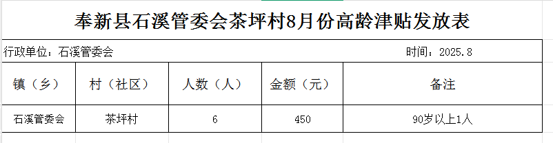 【高齡津貼】奉新縣石溪管委會茶坪村2025年8月份高齡津貼發放表