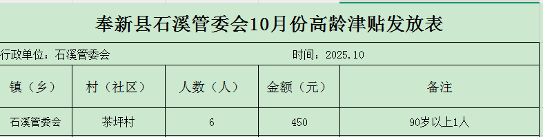 【高齡津貼】奉新縣石溪管委會(huì)茶坪村2025年10月份高齡津貼發(fā)放表