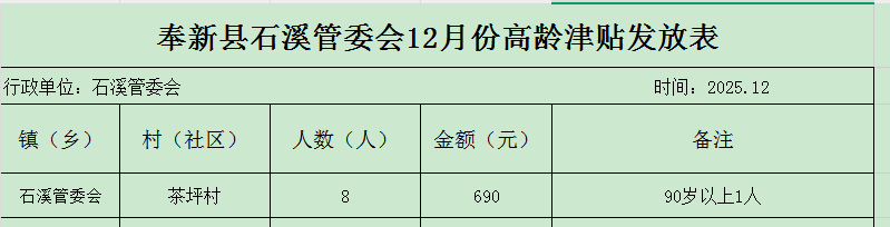 【高齡津貼】石溪管委會茶坪村2025年12月份高齡津貼發放表